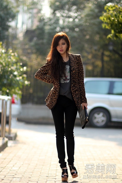 豹紋外套,個(gè)性十足。聳肩的版型,西裝的款式,穿在身上很顯氣質(zhì)。內(nèi)搭灰色T恤下穿黑色小腳褲,高跟鞋,優(yōu)雅女人味十足。