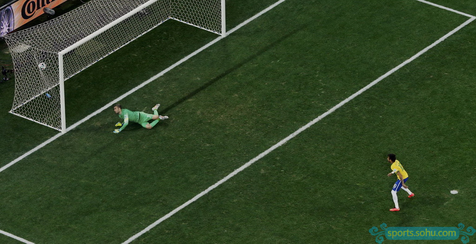 北京時(shí)間6月13日凌晨4時(shí),2014年巴西世界杯揭幕戰(zhàn)在圣保羅競技場(科林蒂安競技場、伊塔蓋拉球場)展開,東道主巴西暫時(shí)2-1反超東歐勁旅克羅地亞。第69分鐘,奧斯卡右路低傳,弗雷德禁區(qū)內(nèi)得球,洛夫倫在身后有一個(gè)并不明顯的拉扯動(dòng)作,巴西前鋒應(yīng)聲倒地,主裁判西村雄一順勢判罰點(diǎn)球,還向洛夫倫出示一張黃牌。克羅地亞球員不干了,立即圍住主裁判理論,但已經(jīng)無法改變結(jié)果。內(nèi)馬爾主罰的點(diǎn)球罰下球迷右側(cè),普萊蒂科薩撲到皮球但仍無法阻止皮球入網(wǎng),2-1,巴西逆轉(zhuǎn)比分,內(nèi)馬爾梅開二度。圖為破門瞬間