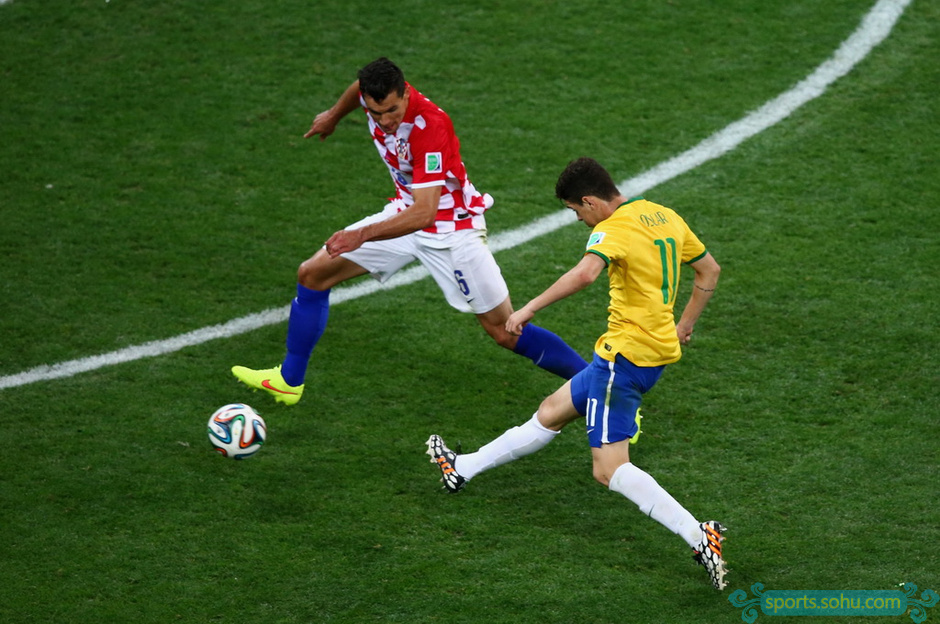 在巴西和克羅地亞的比賽最后時(shí)刻,拉米雷斯中場(chǎng)斷球,奧斯卡單騎闖關(guān),在禁區(qū)邊緣一記捅射再次洞穿普萊蒂科薩的十指關(guān),3-1,巴西鎖定勝局。最終,巴西隊(duì)?wèi){借內(nèi)馬爾的2個(gè)進(jìn)球,3-1逆轉(zhuǎn)克羅地亞贏得本屆世界杯的開(kāi)門紅。圖為奧斯卡捅射瞬間