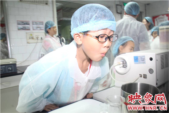 穿上白色的參觀服、戴上一次性帽子,受邀家庭進(jìn)入了檢測(cè)區(qū),參觀了質(zhì)量控制的檢測(cè)工作流程。正在工作的品控員,現(xiàn)場(chǎng)邀請(qǐng)了一名小朋友進(jìn)行了其中一項(xiàng)檢測(cè)--白利度檢測(cè)。“簡(jiǎn)單來講,就是利用密度儀,測(cè)試一瓶飲料的糖度和含氣量?jī)蓚€(gè)指標(biāo)?!逼房貑T張青介紹道。