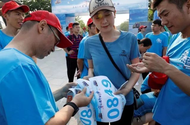 跑完全程的跑者井然有序地領(lǐng)取小酒
