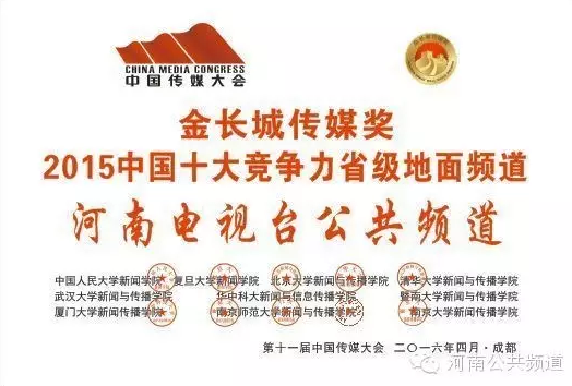 河南公共頻道報榮獲“金長城傳媒獎·2015年中國十大競爭力省級地面頻道”榮譽。