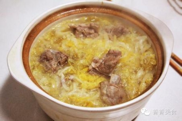 1、先將排骨過(guò)開(kāi)水燙去血沫。買來(lái)的酸菜切小塊,將酸菜的厚幫子片成薄片,在冷水中浸泡一會(huì)兒。蔥姜切沫。