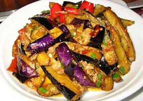 2、加中等偏大量的油, 7、8成熱的時候下鍋翻炒,待到茄子有點軟的時候起鍋。再在鍋中放少量油, 切好蔥姜蒜末暴之,然后放大約二兩左右的肉絲,要大一些,肉片最好,爆炒,熟了以后放茄子,立刻放醬油,少量的水,糖,雞精,鹽,悶之。
