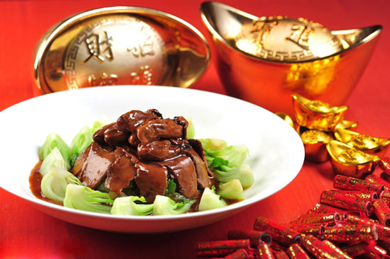 廣東人把年夜飯稱為“團(tuán)年飯”,不但飯菜品種豐富,而且很講究意頭。一家人吃團(tuán)年飯前要先祭祖或拜神,香燭燒完才開(kāi)飯。席上一般有雞(寓有吉)、魚(yú)(寓年年有余)、蠔豉(寓好市)、生菜(寓生財(cái))、腐竹(寓富足)、蒜(寓會(huì)計(jì)算)等以求吉利。廣東有的地方在吃團(tuán)年飯時(shí),若有新婚夫婦,會(huì)多擺一副碗筷,取來(lái)年添丁吉意。