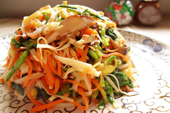 《金陵歲時(shí)記》記載了南京人除夕的“十景菜”(也叫什錦菜),人們以醬姜、黃瓜、胡蘿卜、金針菇、木耳、冬筍、白芹、醬油干、百葉、面筋十種,細(xì)切成絲,以油炒之,這就是所謂的“十景”。這些菜都有著美好的寓意:黃瓜,象征瓜瓜連連、子孫蔓延;冬筍,象征雨后春筍節(jié)節(jié)高;百葉,象征百依百順樣樣順,都是要討個(gè)吉利的口彩?,F(xiàn)在的什錦菜已經(jīng)不止10種了,甚至多達(dá)16-18種,增加了藕,象征路路通;黃豆芽,象征如意;薺菜,象征聚財(cái);馬齒莧,南京又稱安樂(lè)菜,象征平安喜樂(lè)。