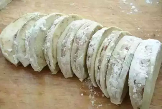 3. 茄子去皮切成連刀片,要切的薄一點(diǎn),便于成熟,抹少許面粉。
