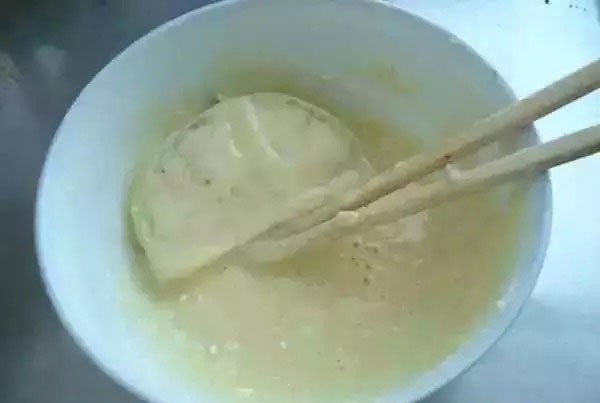 7. 面粉里放入雞蛋,鹽,不要加水,拌勻。茄團(tuán)掛糊。