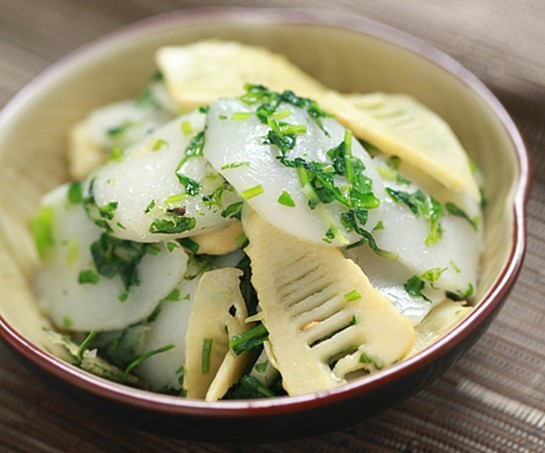 咸肉用清水浸泡半小時(shí)后切丁,春筍切絲,薺菜洗凈切末。鍋中放少量油,油熱后加咸肉丁翻炒至肥肉部分半透明,下筍絲煸炒至香。然后倒入年糕片翻炒,加少許清水、鹽,炒至年糕軟身。最后下薺菜,翻炒均勻后,加少許雞精即可。