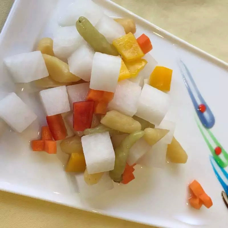 做法:象牙白蘿卜去皮切丁,仔姜和彩椒分別切丁,用白糖,白醋,玫瑰露酒調(diào)成汁,把所有原料泡進(jìn)去,放冰箱腌2小時(shí)即可食用。
