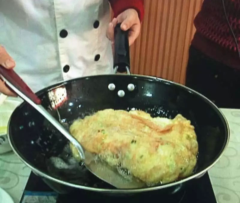 第三步,放入一點(diǎn)鹽等調(diào)料之后將拌入肉末的蛋液放入油鍋煎炒,成熟以后出鍋。
