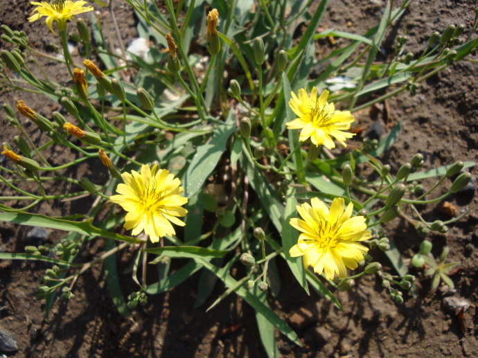 原生形態(tài):抱莖苦荬菜多年生草本,高可達1米許。根粗壯而垂直。莖直立。根生葉排成蓮座狀,葉片長圓狀倒披針形,倒向羽裂狀或羽狀缺刻,先端短尖或鈍圓,基部慚狹成柄,花期通常不萎落;莖生葉基部抱莖。頭狀花序排成傘房狀;總苞圓摘狀,外層苞片極短小,內(nèi)層苞片線狀披針形;花黃色,全部為舌狀花,先端5齒裂;花柱細長,柱頭2裂,冠毛白色,一層。瘦果紡錘形,稍扁,果喙長約為瘦果的1/4,通常與瘦果不同色?;ㄆ诖杭尽I谏侥_、路邊、疏林內(nèi)、河邊。