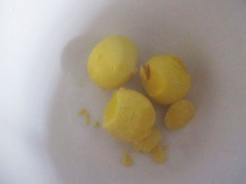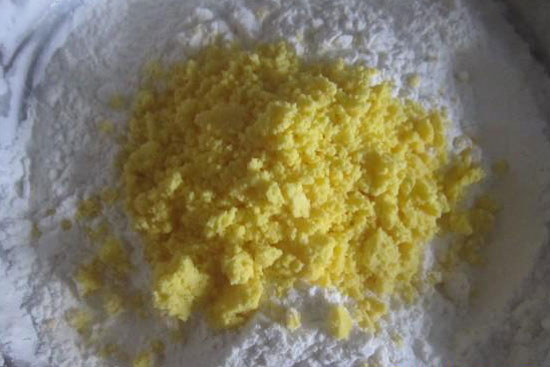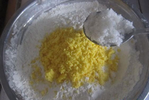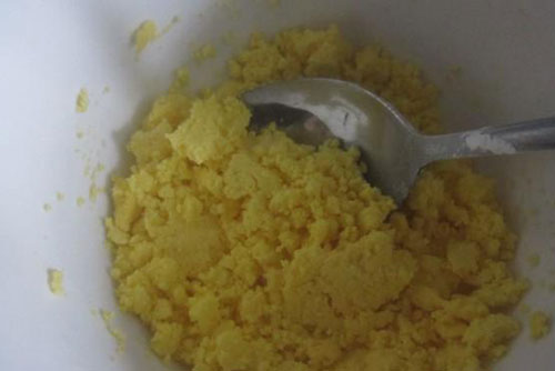 5.將壓碎的蛋黃放入盆內(nèi),可使做出的餅干口感更酥更脆。