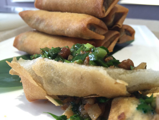 去皮五花肉剁成帶有顆粒感的肉餡,調(diào)好味道,炒熟、晾涼就可以用了。炒餡的時候師傅還用到了具有濃郁開封特色的調(diào)味料,肉餡炒好后韭菜的加入也是頗為講究的,最后像疊被子一樣將春卷包好,下鍋炸成金黃色就可以了!你看,這酥脆的外皮很誘人對不對!