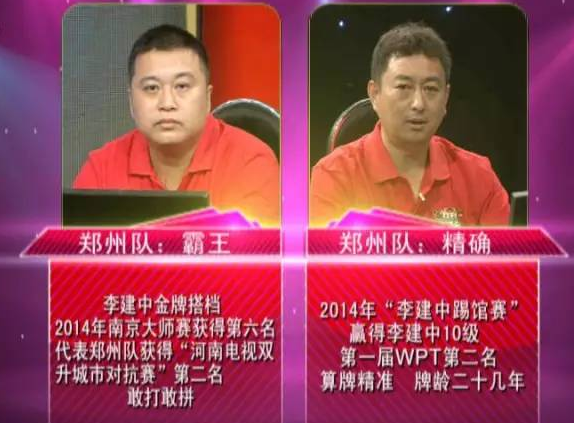 鄭州隊派出了“霸王”和“精確”?!鞍酝酢痹?015年“李建中踢館賽”期間,與李建中是金牌搭檔;在2014年南京大師賽上獲得第六名;曾代表鄭州隊獲得“河南電視雙升城市對抗賽”第二名,經(jīng)常活躍在雙升銀屏的舞臺上。