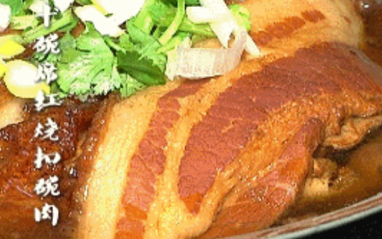 選用優(yōu)質(zhì)五花肉,切成大塊,在白蘿卜水中上色。七成油溫浸炸至七分熟,撈出的五花肉顏色金黃,與用蜂蜜上色效果差不多。