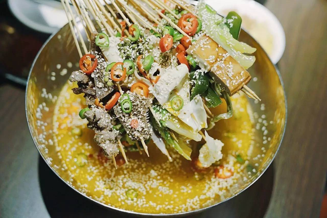 重慶喜辣更江湖,成都重麻更市井。而椒麻鍋底的冷鍋串,就是成都特色。藤椒芝麻和小米辣的放入,讓鍋底有了香麻的口感。青白兩色的搭配,看起來也特別清爽。