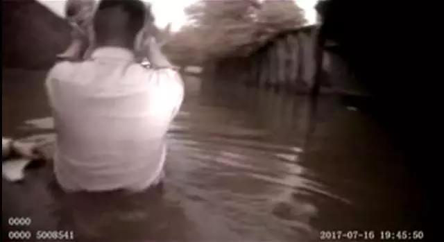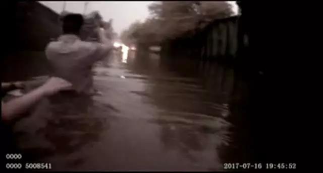 由于積水太深,為了不讓孩子受到傷害,輔警張婧先把最小的嬰兒接過來,高高舉起,緩緩走到岸上。