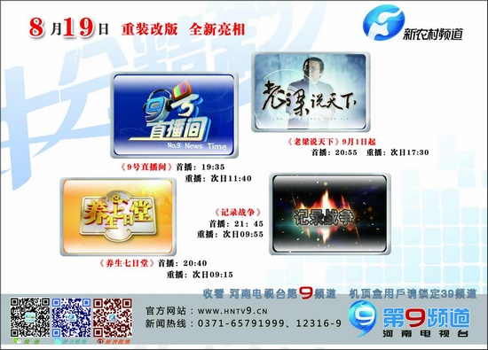 8月19日新農(nóng)村頻道全新亮相!19:35《9號直播間》;20:40《養(yǎng)生七日堂》;21:45《記錄戰(zhàn)爭》;四檔電影,視覺盛宴!14:43《第9放映室午間版》,17:55《群影匯》,22:00《第9放映室》,23:50《午夜影吧》,河南9套好電影,精彩不斷連連看!