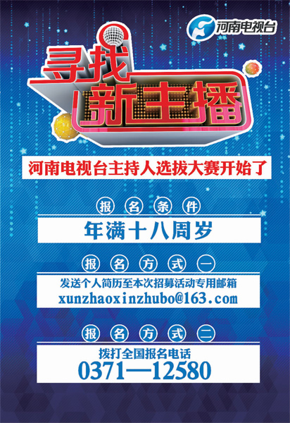 10月1日起,河南電視臺(tái)將啟動(dòng)“尋找新主播”活動(dòng)。這是由河南電視臺(tái)都市頻道承辦的一檔大型主持人選拔活動(dòng),選拔范圍輻射全國(guó),無(wú)論你在哪里,無(wú)論你正在從事哪個(gè)行業(yè),只要您年滿(mǎn)18周歲,沒(méi)準(zhǔn)兒下一個(gè)“新主播”就是你!