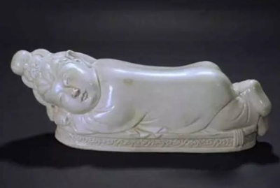 這件宋定窯“美人枕”,長43厘米,寬15.5厘米,質(zhì)地細(xì)膩,釉色白潤如玉,工藝精巧。此枕塑造了一個(gè)豐滿美人的“迷人睡姿”—其雙手枕于頭下,兩腳疊壓稍稍抬起,衣紋線條流暢,盡顯雍容華貴,透露出唐人遺風(fēng)。