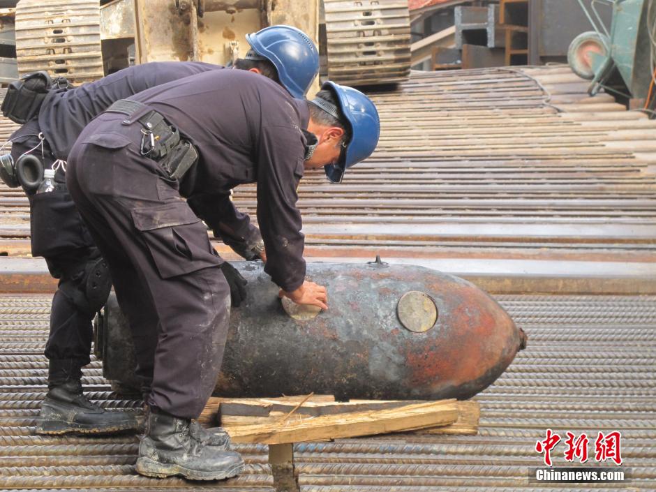 2月6日下午,香港跑馬地一處工地發(fā)現(xiàn)二戰(zhàn)時美軍投下的炸彈。炸彈重約2000磅(約907公斤)、內(nèi)含約1000磅(約453.6公斤)黃色炸藥,炸彈長約67英吋、直徑約24英吋,引信仍然存在,炸藥亦有效。經(jīng)通宵作業(yè),香港警方7日早成功拆除炸彈。中新社發(fā) 趙建華 攝