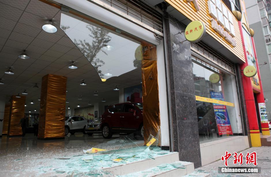 10月29日下午,重慶市永川區(qū)玉屏北路水韻書香居民小區(qū)南門,一輛新車從小區(qū)旁售車大廳急駛而出,車頭朝左奔入人行道急駛10余米,撞上安放在人行道上的石墩,并頂著直徑30多公分的石墩朝左向小區(qū)前行,又撞壞小區(qū)車行進(jìn)口道邊的刷卡器后奔進(jìn)小區(qū)3米左右停下。新車從售車大廳駛出直至小區(qū)里面停下,足足有30多米遠(yuǎn)。據(jù)售車人員和小區(qū)保安介紹:當(dāng)時(shí),該名女司機(jī)駕駛剛買的新車從售車大廳出來(lái),副駕駛坐著她的弟弟,售車人員則在車頭前指引。不知何故,女駕駛員就開著車撞爛大廳玻璃門沖向人行道、沖進(jìn)小區(qū)。幸好事發(fā)時(shí)沒(méi)有人經(jīng)過(guò),不然后果不堪設(shè)想。 中新社發(fā) 陳仕川 攝 圖片來(lái)源:CNSPHOTO