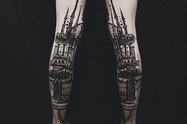 巴頓在人體的手部、胸部和腿部作畫。這套紋身作品,主要以風(fēng)景和建筑為題材,結(jié)合人體藝術(shù),利用人體的對(duì)稱感和立體感,打造視覺上的驚艷效果。