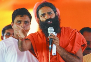 3日,新德里,計(jì)劃發(fā)起反腐敗絕食抗議行動(dòng)的印度瑜伽大師拉姆德夫(右)向支持者講話。