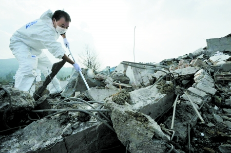 救援人員正用生命探測(cè)儀探測(cè)