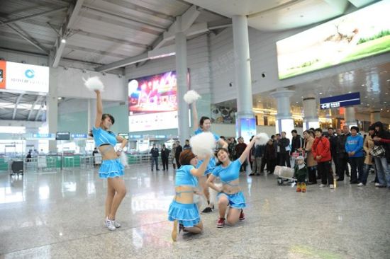 為穩(wěn)定旅客情緒,大連機(jī)場(chǎng)請(qǐng)來(lái)美女拉拉隊(duì)員跳操,引來(lái)眾多旅客圍觀。新青年網(wǎng)