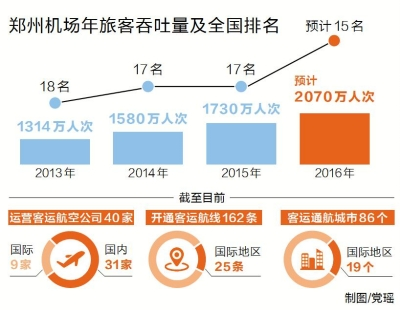 據(jù)鄭州機場相關(guān)負(fù)責(zé)人介紹,2014年鄭州機場旅客吞吐量突破1580萬人次,同比增長20%,增速位居全國20個大型機場首位。