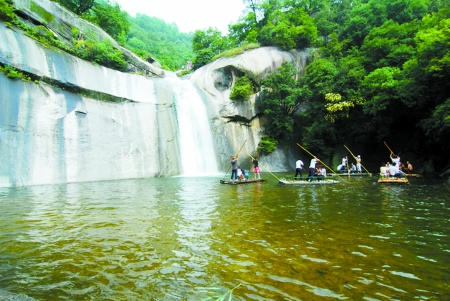 龍?zhí)稖仙角逅?,石奇崖險(xiǎn),頗具登臨之趣。整個(gè)峽谷兩側(cè)是花崗巖山體,一色的蒼青如黛,更顯巨石秀姿。大龍?zhí)陡浇囊粔K巨石酷似鱷魚頭,正伸入水中飲水,游人稱之為“鱷魚戲水”;“四連瀑”附近有塊巨石更是神奇,從對(duì)面山頭看,猶如豬八戒的頭,像是伸出水面偷看龍女洗澡,人們稱之為“八戒窺浴”;從后面看又酷似船頭,因此又叫“船石”;黑龍?zhí)杜赃呌腥龡l極像鯊魚的巨石,魚頭伸向潭水,美其名曰“三鯊鬧龍?zhí)丁?。此外,還有“絕壁掛雪”、“神龜過(guò)江”、“鯉魚跳龍門”等。奇石遍布,形態(tài)各異,惟妙惟肖,渾然天成。