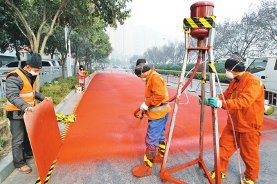 “機動車道6米寬,鋪設(shè)‘綠道’的自行車道也為6米寬。看慣了灰黑色的路面,在看到色彩明銳的‘綠道’后肯定覺得眼前一亮?!G道’只是叫法,并不是說道路外觀一定是綠色的,在景觀設(shè)計中,‘綠道’往往有著更深更廣的內(nèi)涵?!惫こ特撠熑藚蜗壬嬖V記者,彩色瀝青厚度僅為1到2毫米,壽命在5年以上,具有警示、防滑、降噪、美觀等特點?!拔覈G道’通常以警示色紅色為主打,主要作用是打造人車分離模式,供騎車者和步行者休閑使用?!?/p>