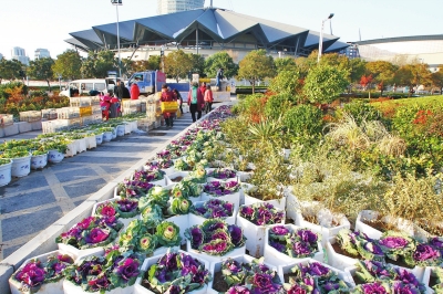 “嘿,快看,真美!感覺好像瞬間穿越到了絢麗多彩的春季!”昨日中午,在鄭東新區(qū)CBD商務(wù)內(nèi)環(huán),幾名市民指著花壇內(nèi)一大片黃、紅、紫三色相間的鮮花說。在這里,記者看到一撥撥工作人員正忙著將一盆盆鮮花擺放到預先設(shè)置好的花架上。姿態(tài)秀逸、枝葉扶蘇,綴滿鮮艷奪目紅果的南天竹十分吸睛;各種色彩亮麗的花朵,則為冬日的鄭州增添了一抹迷人的色彩;株形如牡丹,葉片形態(tài)美觀多變,觀賞性不輸鮮花的甘藍更是隨處可見。